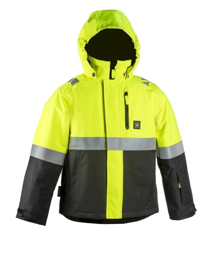 Dimex lasten talvitakilla varmistat, että lapsesi pysyy lämpimänä, kuivana ja näkyvillä ulkoleikeissä. Teipatut saumat ja vedenpitävä materiaali eivät päästä kosteutta sisään. Kangas on todella kestävää työvaatekankaanakin käytettyä kierrätyspolyesteriä. Vanu on lämmintä Thinsulate-vanua, jonka käyttömukava ohuempi rakenne omaa samat lämpöarvot kuin paksumpi perusvanu. Lämmöneristävyys ei myöskään heikkene pesussa. Huomiovärillä ja heijastimilla takin käyttäjä erottuu hyvin myös pimeässä tai hämärässä. Takissa on irrotettava ja nyörillä säädettävä huppu.